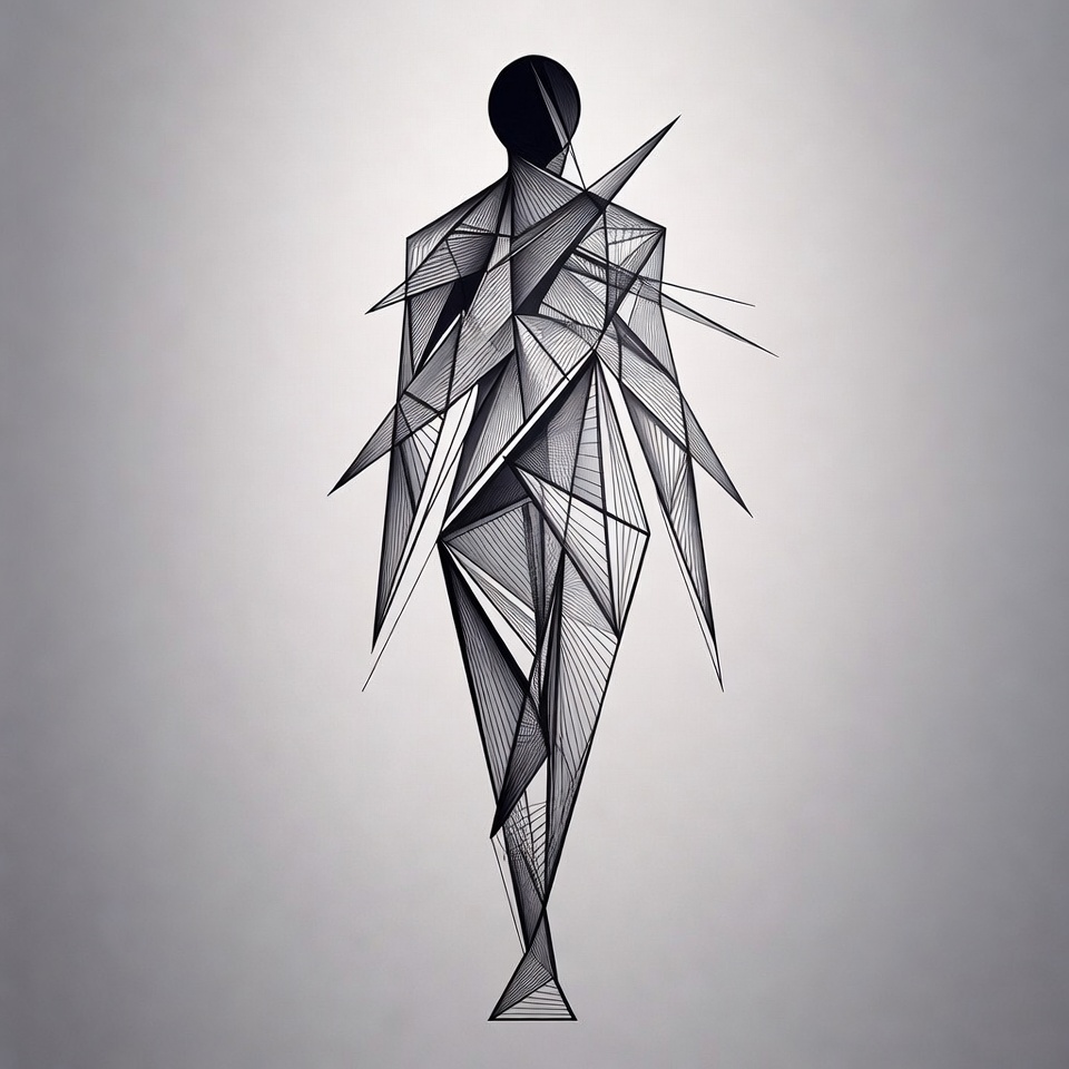 A minimalist black silhouette of a man in a walking pose is constructed from sharp geometric lines and triangles. The figure stands against a light gray gradient background. Intricate angular patterns form the body, arms, and legs.