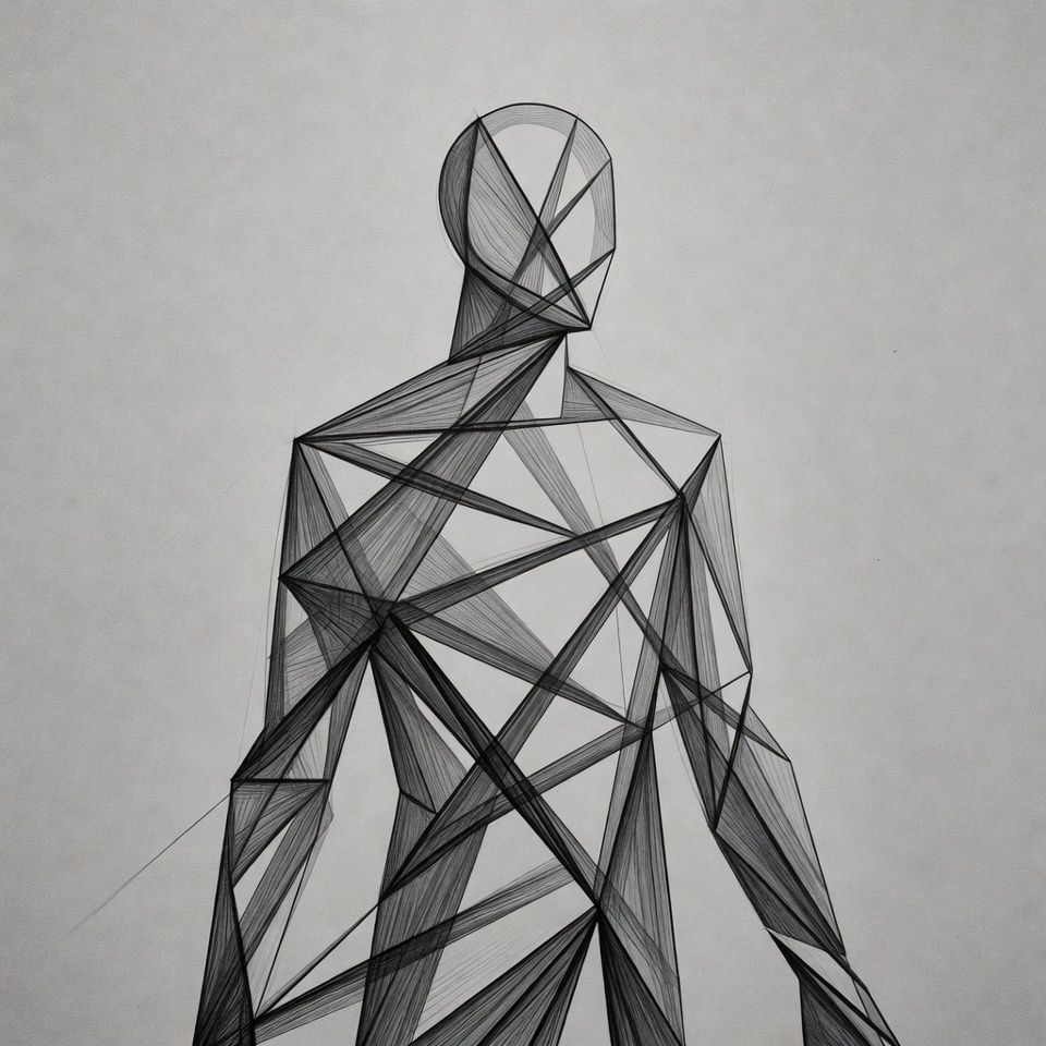 abstract figure, artistic drawing, black lines, human figure, illustration, isolated background, line art, line drawing, male, minimalist art, polygonal figure, standing pose, triangle pattern, wireframe body, geometric art