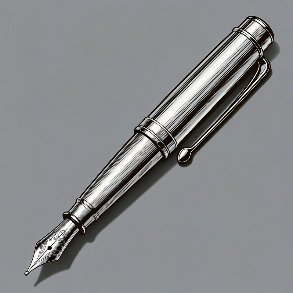 A detailed line art illustration of a shiny silver fountain pen with a fine nib. The pen features engraved patterns on the barrel, a clip, and is positioned diagonally on a gray background. It has a classic, elegant design with metallic highlights.