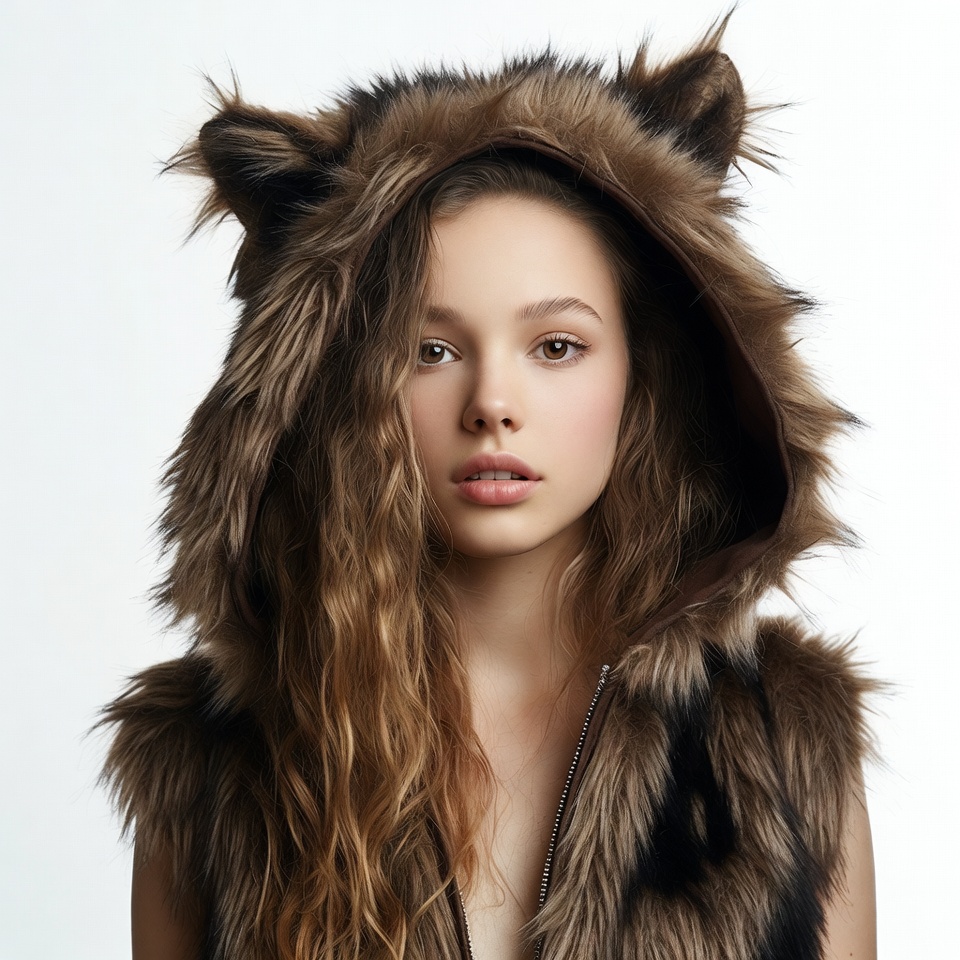 White, animal hood, brown fur, brown hair, cute, ears, fashion, faux fur, female, fluffy, furry hood, hood, isolated background, portrait, vest, wavy hair, wolf ears, wolf hood, young girl, girl