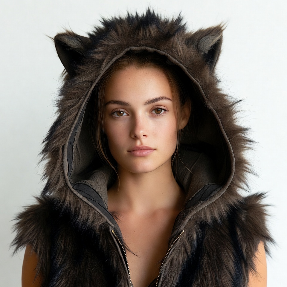 White, animal hood, brown fur, closeup, cosplay, ears, fashion, faux fur, female, fluffy hood, fur hood, hazel eyes, isolated background, light hair, portrait, vest, wildlife costume, wolf ears, wolf hood, young woman, woman