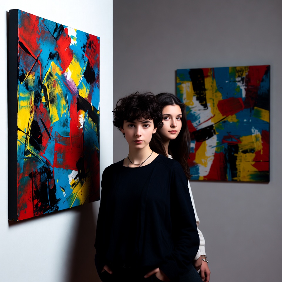 Two young women with curly and long dark hair stand in front of large colorful abstract paintings in an art gallery. The woman in front wears a black sweater and necklace, while the one behind has on a white top. The vibrant artworks feature bold reds, blues, yellows, and blacks on white walls.