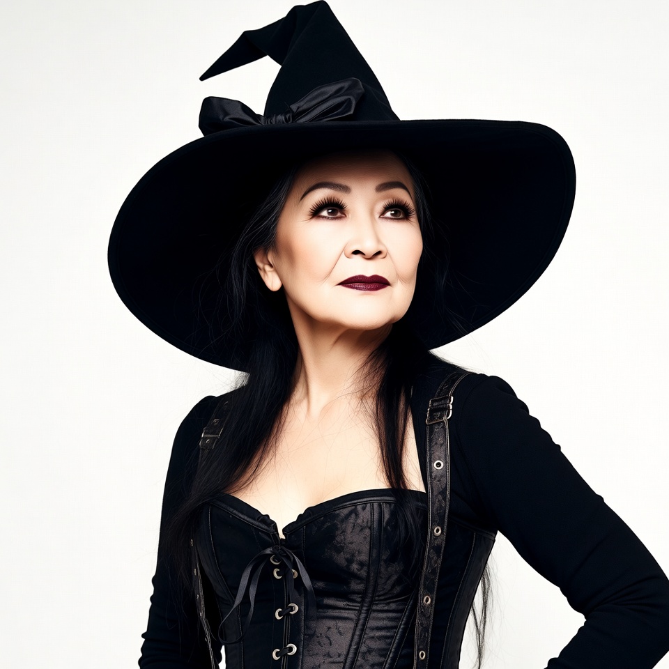An Asian woman with long black hair wears a large black witch hat adorned with a bow. She is dressed in a black corset top with leather straps over a long-sleeved black shirt. She poses confidently against a white background.