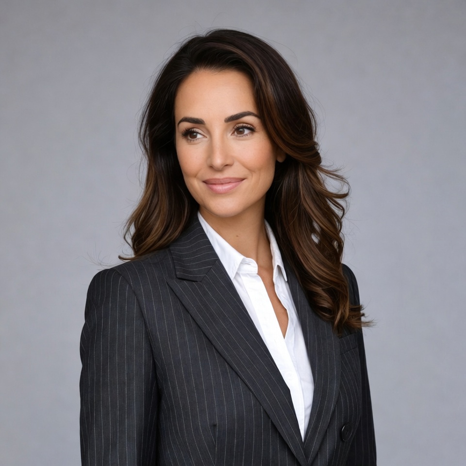 A woman with long wavy brown hair stands in profile wearing a dark pinstripe suit jacket and white collared shirt. She has a subtle smile and is positioned against a plain gray background. Her expression is confident and professional.