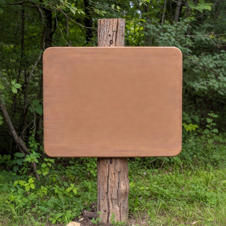 brown sign, empty sign, forest, green foliage, greenery, isolated sign, log post, natural background, nature, outdoors, park sign, rustic post, sign post, trail marker, trail sign, trees, wilderness, wooden sign, woods, blank sign