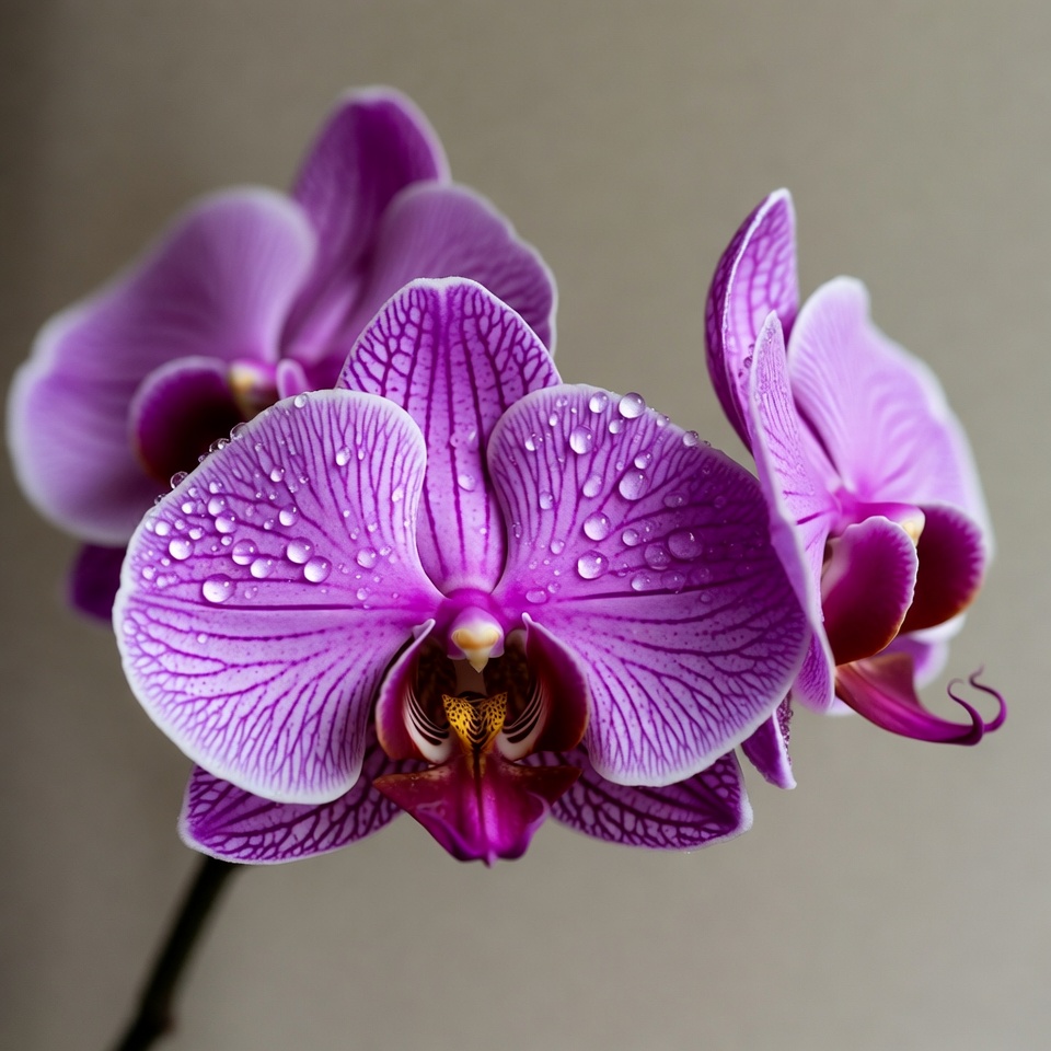 A cluster of vibrant purple orchids features intricate veined petals and water droplets glistening on their surfaces. The flowers are arranged on thin green stems against a soft gray background. The central orchid displays a striking pink and yellow center.