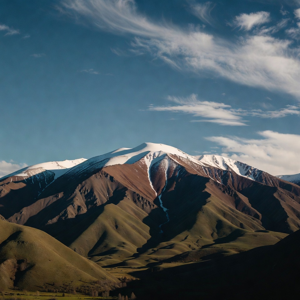 A majestic snow-capped mountain peak rises dramatically against a blue sky with scattered white clouds. The rugged slopes transition from brown rocky areas to lush green valleys below. Shadows accentuate the contours of the terrain in golden hour light.