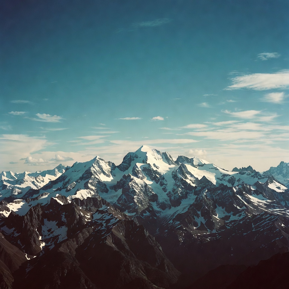 aerial view, alpine landscape, blue sky, clouds, glacier, high altitude, mountain range, nature, outdoors, peak summit, rocky slopes, rugged terrain, scenic vista, snow capped, snowy peaks, wilderness, winter mountains, mountains
