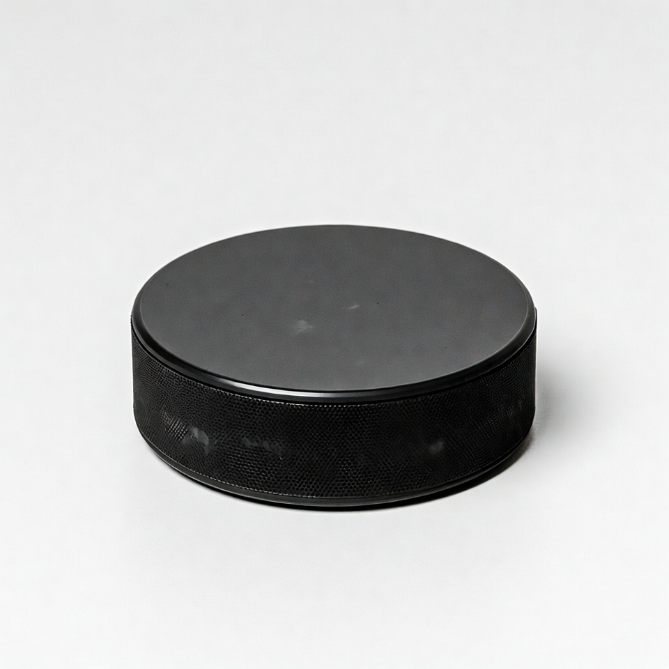 black puck, hockey equipment, hockey sport, ice hockey, isolated background, puck, round puck, rubber puck, sports gear, textured surface, white background, hockey puck