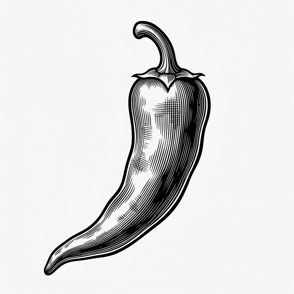 black and white, chilli, clipart, cuisine, curved, design, detailed, drawing, engraving, food, graphic, hot pepper, illustration, isolated, jalapeno, line art, pepper, sketch, spicy, stem, texture, vector, vegetable, white background, chili pepper