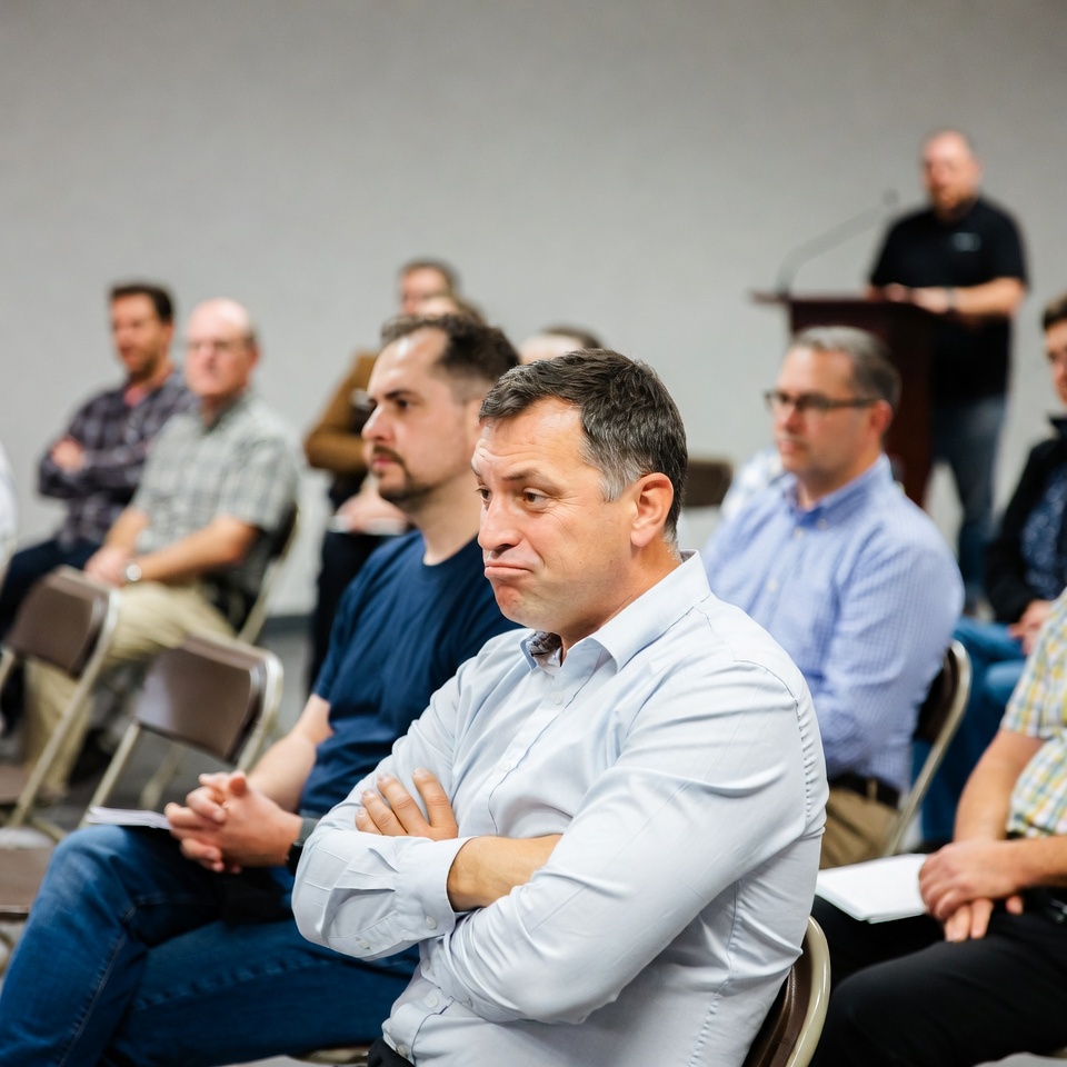 Several middle-aged White men sit in chairs at a conference audience, attentively watching a speaker on stage. The central man with short graying hair wears a white dress shirt, crossed arms, and jeans, with a serious expression. Others wear button-up shirts and casual attire in a spacious indoor room with a podium visible.