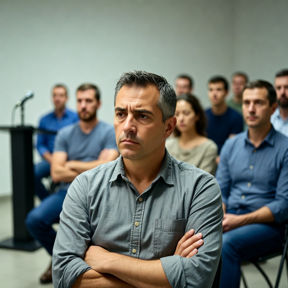 A middle-aged man with short graying hair and arms crossed sits attentively in a conference room. He wears a light blue chambray shirt and dark pants, surrounded by a diverse group of men and women in business casual attire. Several attendees listen from chairs near a podium with a microphone.