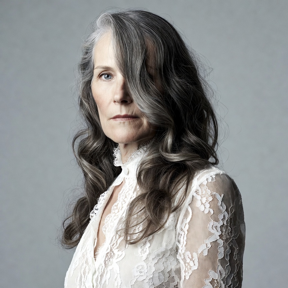 A mature woman with long gray wavy hair gazes directly at the camera. She wears a white lace blouse with a collared neckline. The image features a plain gray background.