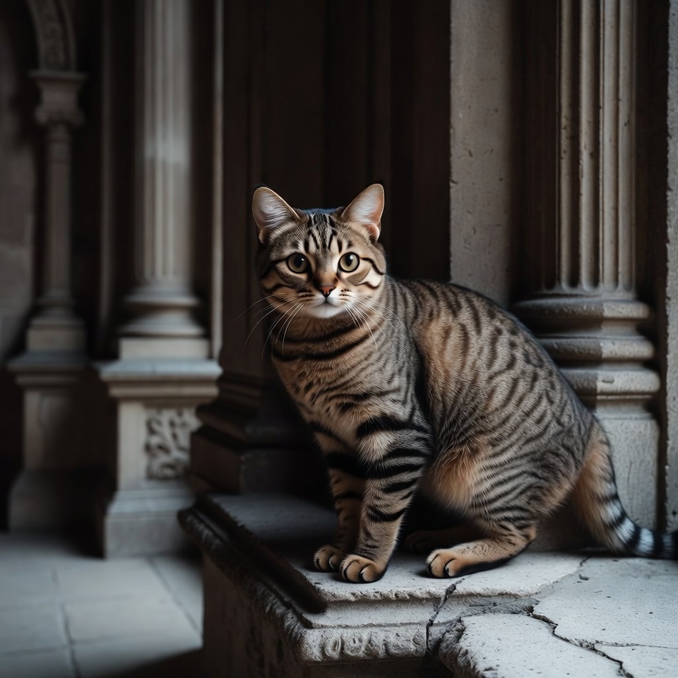 A tabby cat with striped brown fur sits on worn stone steps in a dimly lit architectural setting. Tall stone columns and arches surround the cat, creating a grand, ancient atmosphere. The cat gazes forward with green eyes, paws tucked neatly beneath its body.