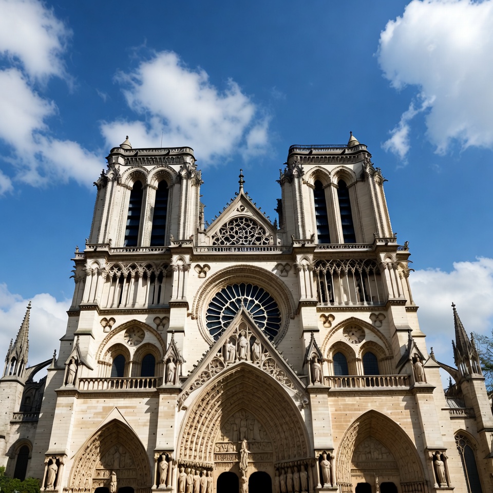 The iconic facade of Notre Dame Cathedral in Paris features two tall towers and a large rose window. Gothic architecture is evident in the pointed arches, ornate stone carvings, and flying buttresses. The building stands against a clear blue sky with scattered white clouds.