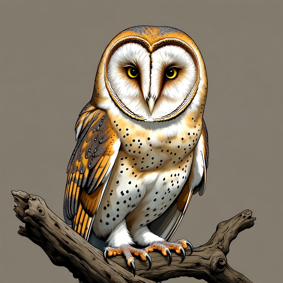 animal, avian, bird, bird of prey, branch, digital art, feathers, illustration, isolated background, large eyes, nature, orange feathers, owl, owl portrait, perched, raptor, realistic illustration, spotted wings, talons, white face, wildlife, yellow eyes, barn owl