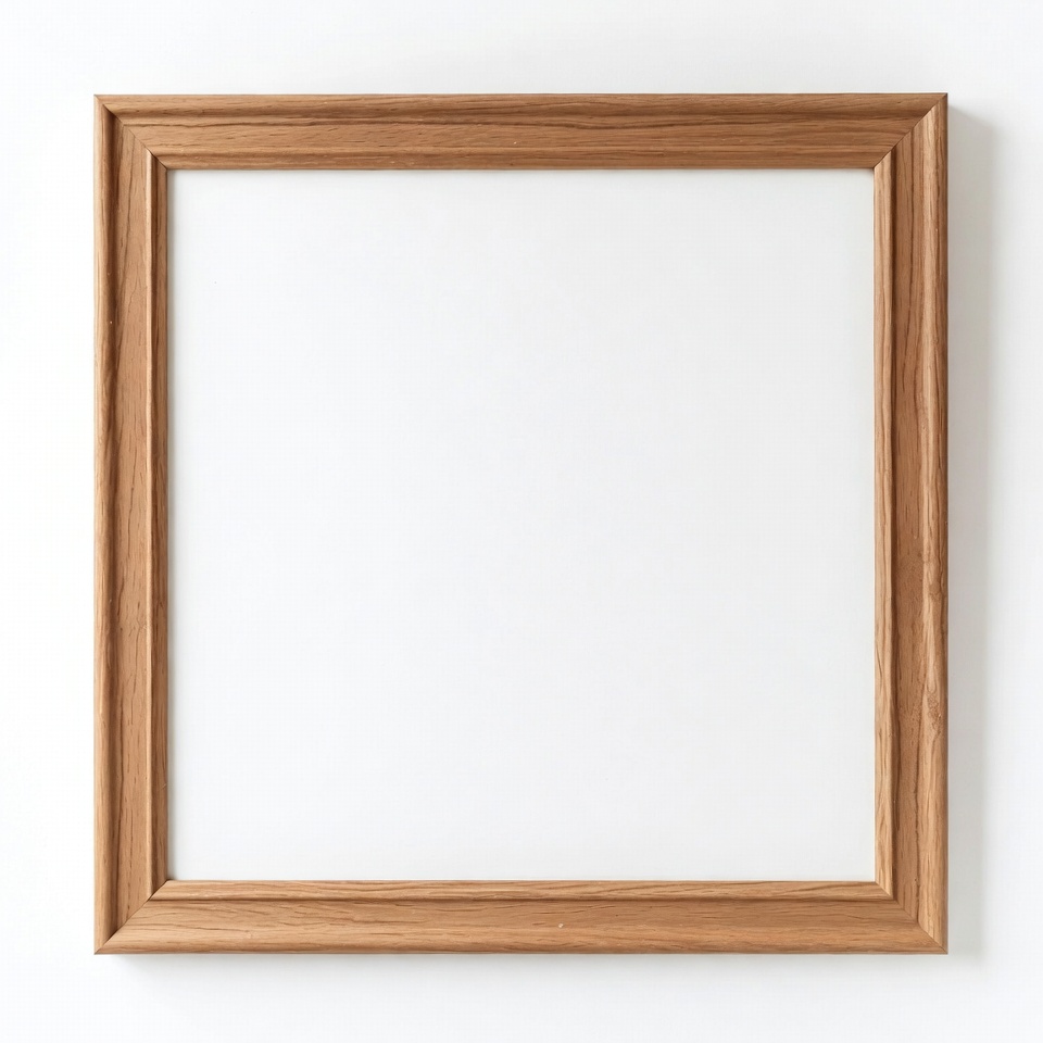 A square wooden picture frame with a light oak finish surrounds a completely empty white space. The frame features a classic ornate design with beveled edges. It is isolated against a plain white background.