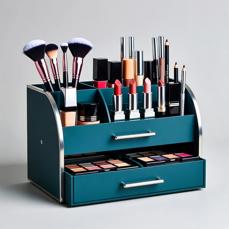 A teal-colored makeup organizer with silver trim features multiple compartments holding various cosmetics. It displays makeup brushes, lipsticks, eyeliners, palettes, and foundation bottles. The organizer stands on a white background with two drawers at the bottom.