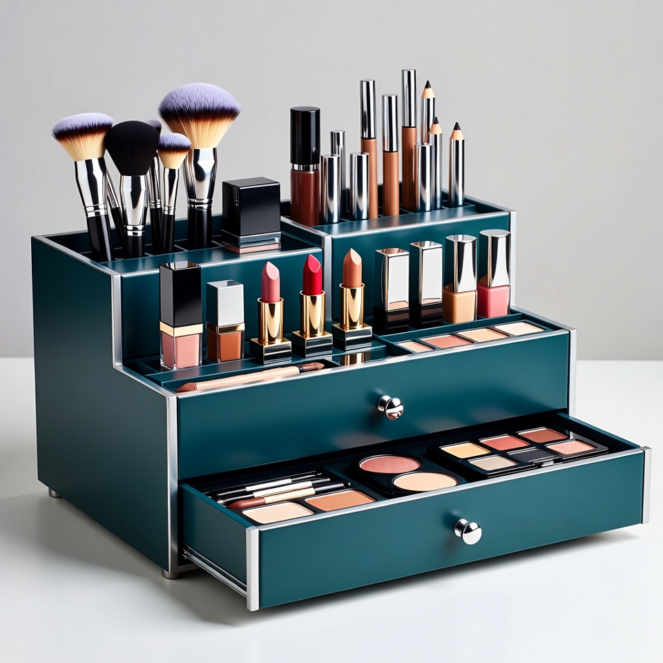 A teal-colored multi-tiered makeup organizer holds various cosmetics on a white surface. It features brushes, lipsticks, eyeliners, palettes, and foundation bottles in organized compartments and drawers. The organizer has a sleek design with metallic accents.