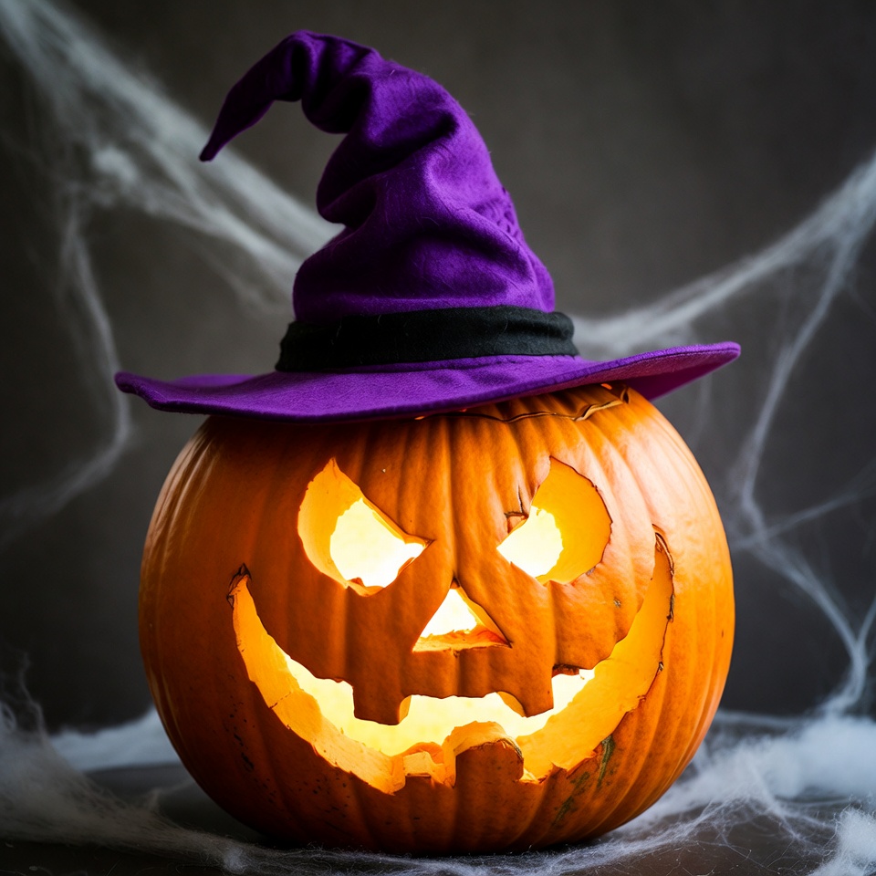A carved orange pumpkin with glowing eyes and a wide grin sits on a dark surface. A floppy purple witch hat rests atop the jack-o-lantern. Cobwebs drape around it against a black background.
