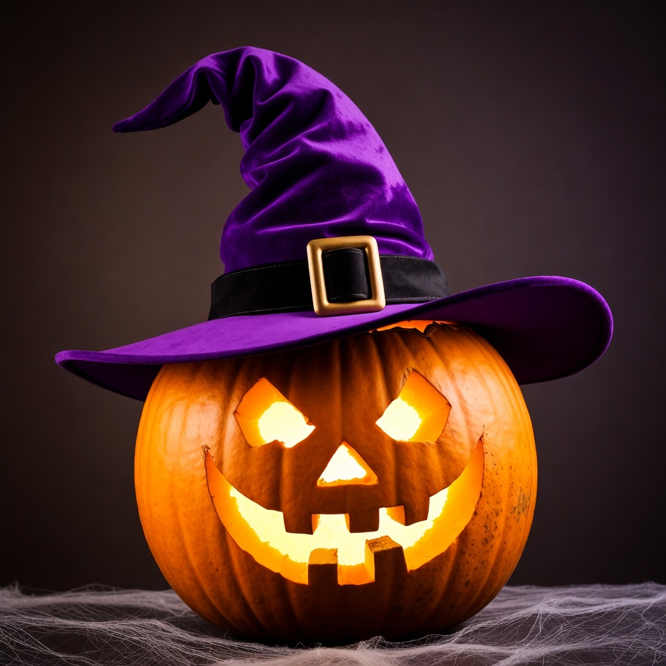 A carved jack-o'-lantern pumpkin with glowing orange eyes, nose, and jagged smiling mouth sits on a dark background with spider web. A tall purple witch hat with a black buckle band tops the pumpkin. The hat's wide brim rests on the pumpkin's surface.