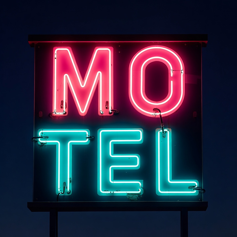 bright lights, cyan neon, dark sky, electric sign, fluorescent sign, glowing motel, glowing sign, illuminated letters, motel advertising, motel logo, motel neon, neon art, neon glow, neon sign, night background, pink cyan neon, pink neon, retro sign, roadside sign, signage, signboard, travel sign, vintage motel, motel sign