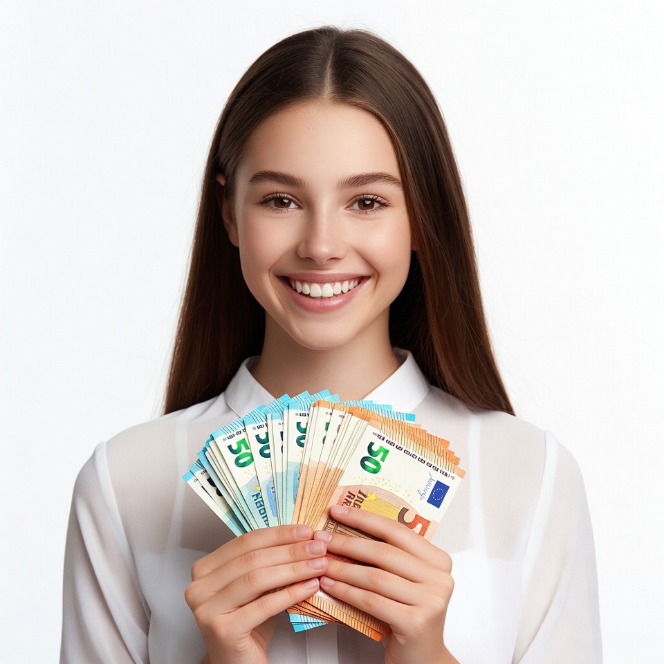A young woman with long brown hair smiles while holding a fan of euro banknotes in her hands. She wears a white collared blouse and stands against a plain white background. The euros feature various denominations in blues, greens, and oranges.