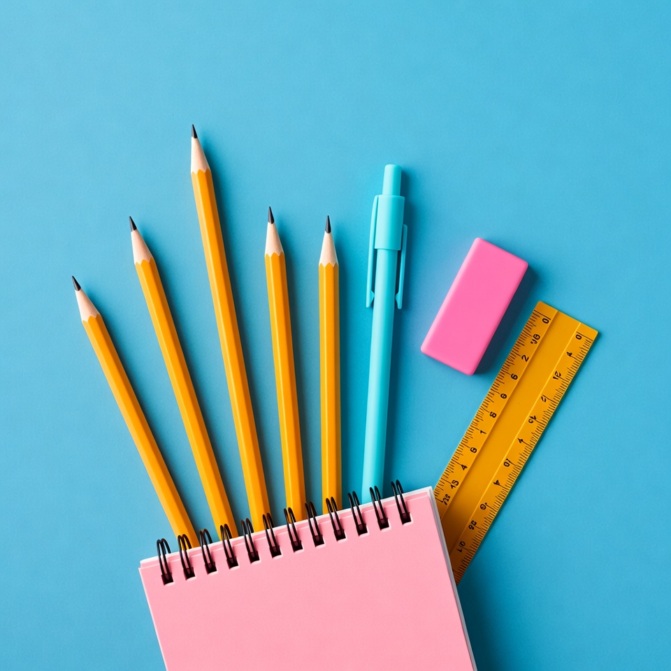 back to school, blue background, blue pen, education, eraser, flat lay, isolated background, learning materials, notebook, office supplies, pen, pencils, pink eraser, pink notebook, ruler, school tools, stationery, writing tools, yellow pencils, yellow ruler, school supplies