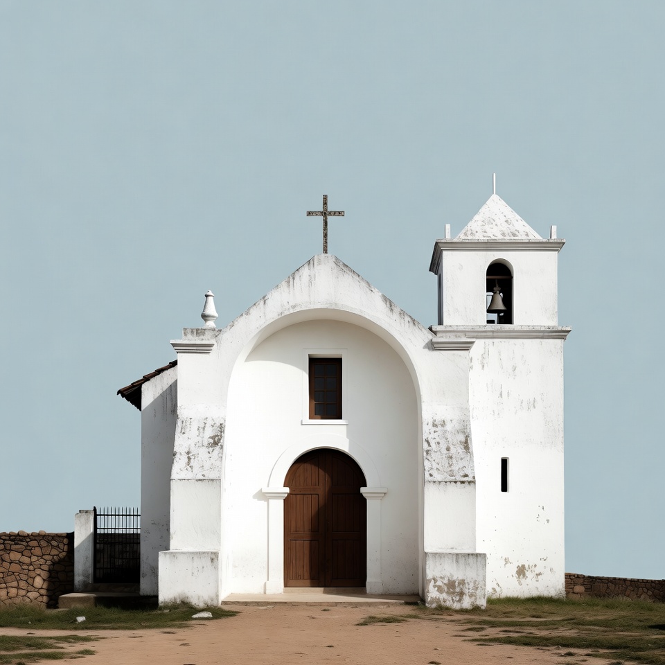 Brazilian chapel, arched door, architecture, bell tower, blue sky, chapel, church, church bell, colonial church, cross, dirt path, grass, religion, steeple, stone wall, wooden door, white church