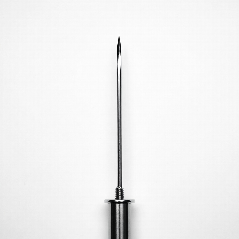 A close-up view of a sharp stainless steel needle with a pointed tip and threaded base. The needle stands vertically against a plain white background. It appears metallic and precisely engineered.