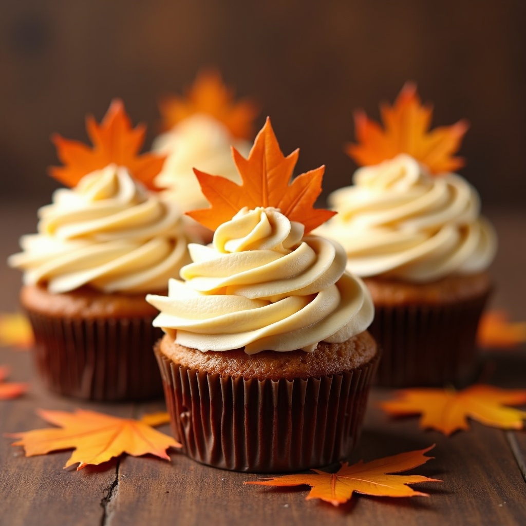 Several vanilla frosted cupcakes topped with orange maple leaves sit on a wooden surface. Scattered autumn leaves surround the cupcakes, enhancing the fall theme. The cupcakes have a rich brown base and creamy white frosting.
