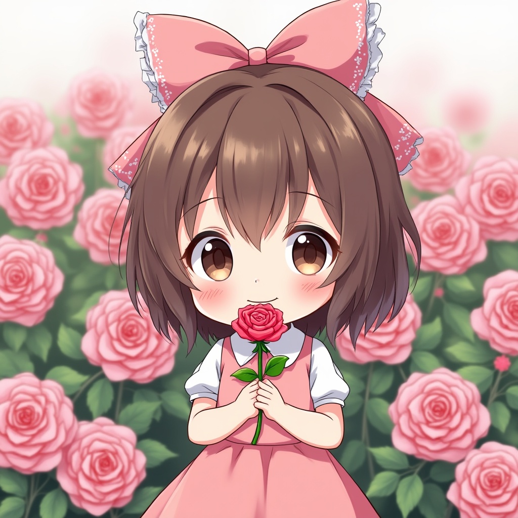 anime art, big eyes, brown hair, chibi style, cute girl, floral background, holding rose, illustration, isolated background, manga character, pink bow, pink dress, pink roses, red rose, rose field, smiling girl, white collar, anime girl