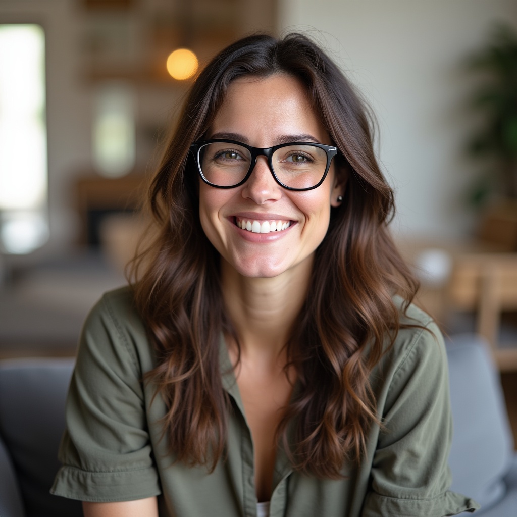 A woman with long wavy brown hair and black-framed glasses smiles warmly at the camera. She wears a green shirt and sits in a modern living room with blurred furniture and plants in the background. Her expression is friendly and approachable.