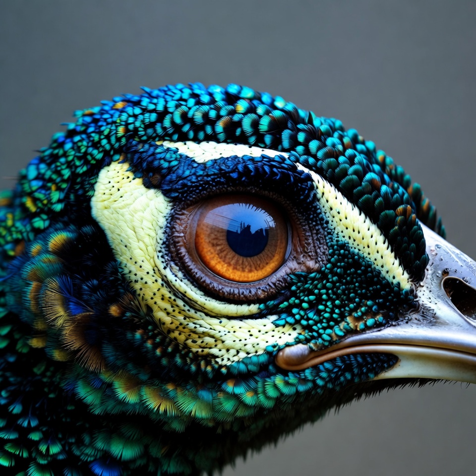 animal, avian, beak, bird, blue feathers, closeup, detailed feathers, eye, feathers, green feathers, head, iridescent, macro, nature, orange eye, peafowl, plumage, vibrant colors, wildlife, peacock