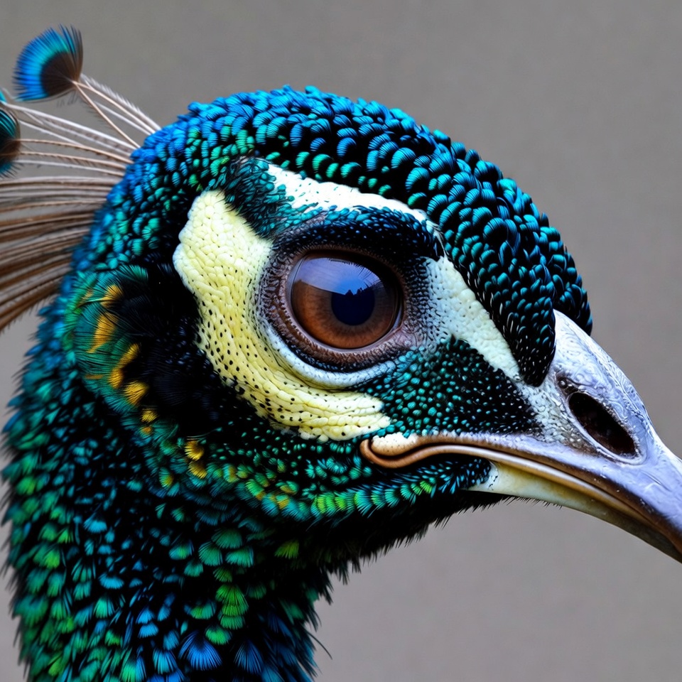animal portrait, avian, beak, bird, blue feathers, blue peacock, brown eye, crest, eye, feathers, green feathers, head close-up, iridescent, neck, peafowl, plumage, wildlife, yellow eye, peacock