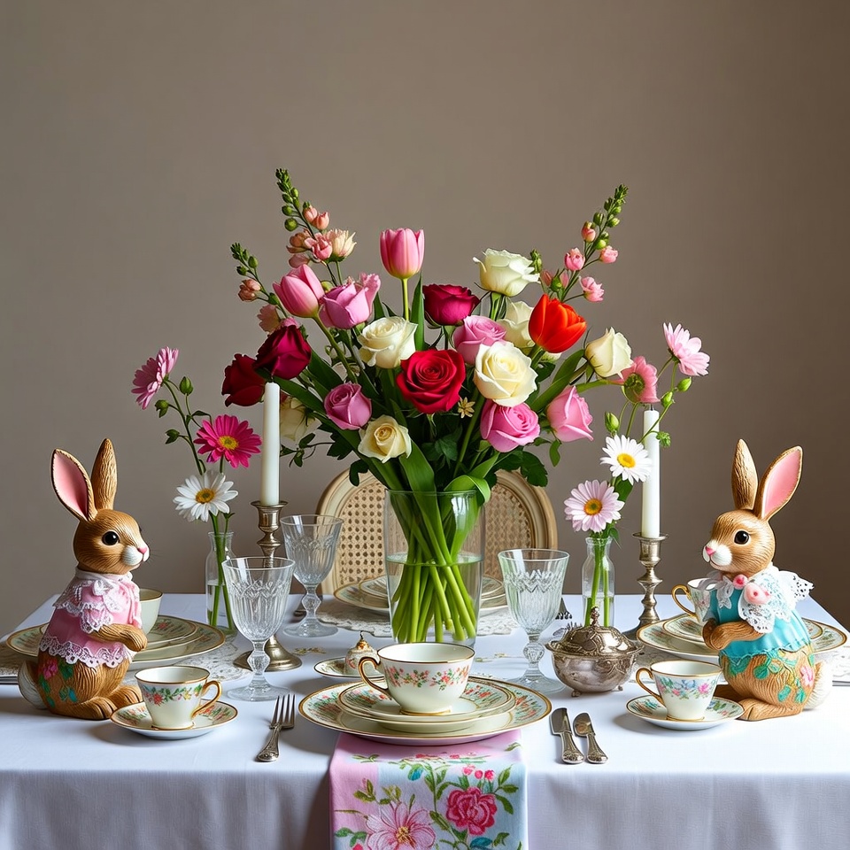 Easter decor, bouquet, brown bunny, candlesticks, daisies, floral arrangement, flowers, glassware, isolated background, pink bunny, pink napkins, plush bunnies, roses, table centerpiece, table setting, teacups, tulips, vintage tableware, white tablecloth, Easter bunnies