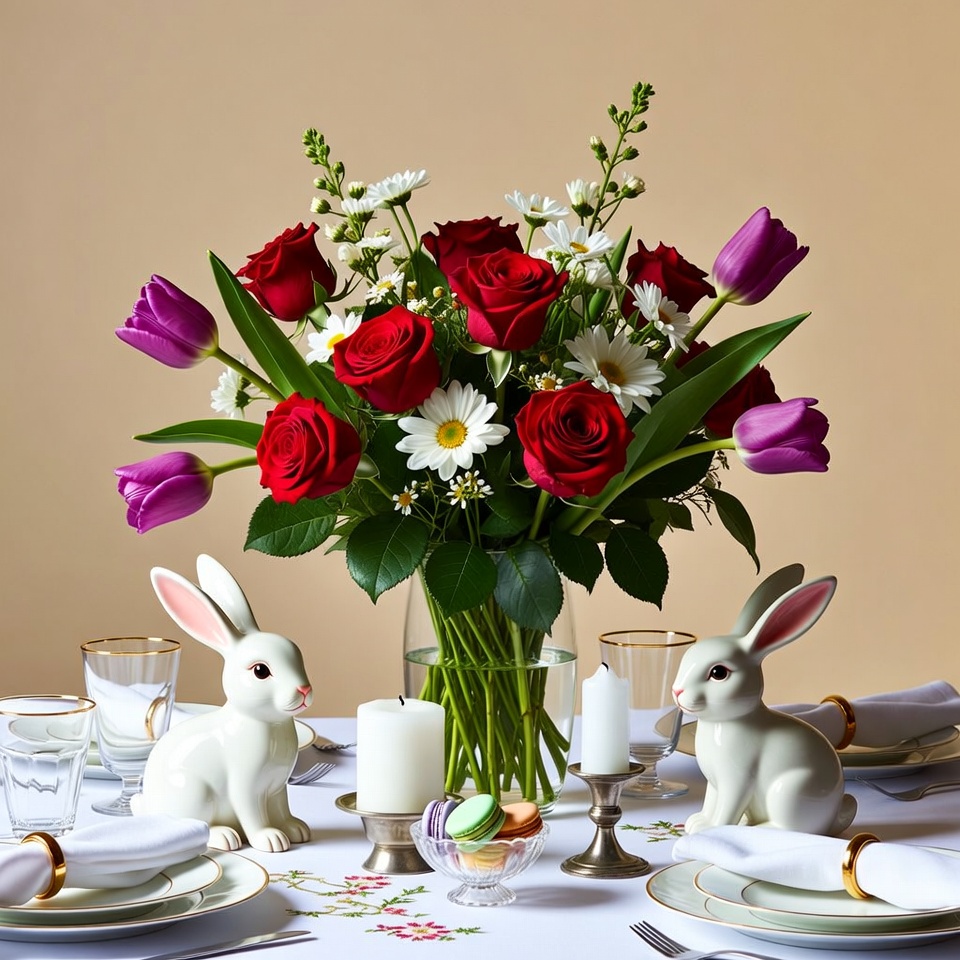 A elegant table setting features a bouquet of red roses, white daisies, and purple tulips in a clear glass vase. Two white porcelain Easter bunnies sit on either side of the vase, surrounded by gold-rimmed glasses, white candles, macarons, and fine china plates with napkins. The setup is on a light beige tablecloth with subtle floral embroidery.