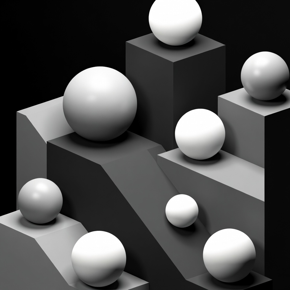 3D render, abstract art, angular forms, balls, black background, blocks, composition, cubes, geometric sculpture, geometric shapes, high contrast, minimalism, monochrome, orb, pedestal, sculpture, spheres, stacked shapes, white objects, white spheres