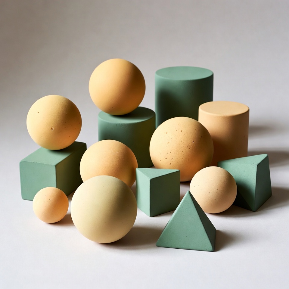 3D shapes, abstract design, art objects, basic geometry, colorful objects, cubes, cylinders, foam shapes, green cylinders, isolated background, matte texture, orange balls, peach color, pyramids, shape collection, speckled surface, spheres, teal color, toy shapes, white background, geometric shapes