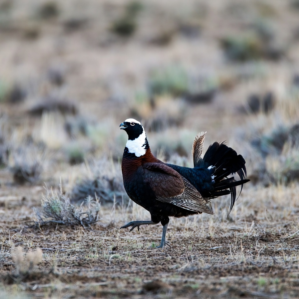 bird, black tail, brown feathers, dry grass, feathers, field, game bird, grassland, iridescent feathers, male pheasant, nature, outdoors, pheasant, red wattles, sparse shrubs, walking bird, white neck ring, wildlife, ring-necked pheasant
