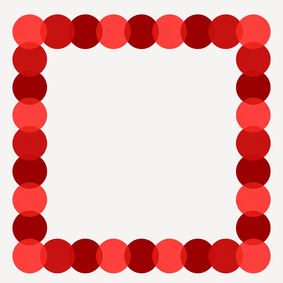 A square frame border made of overlapping red circles arranged along the edges. The interior is a plain white square. The circles vary slightly in shade from light to dark red.