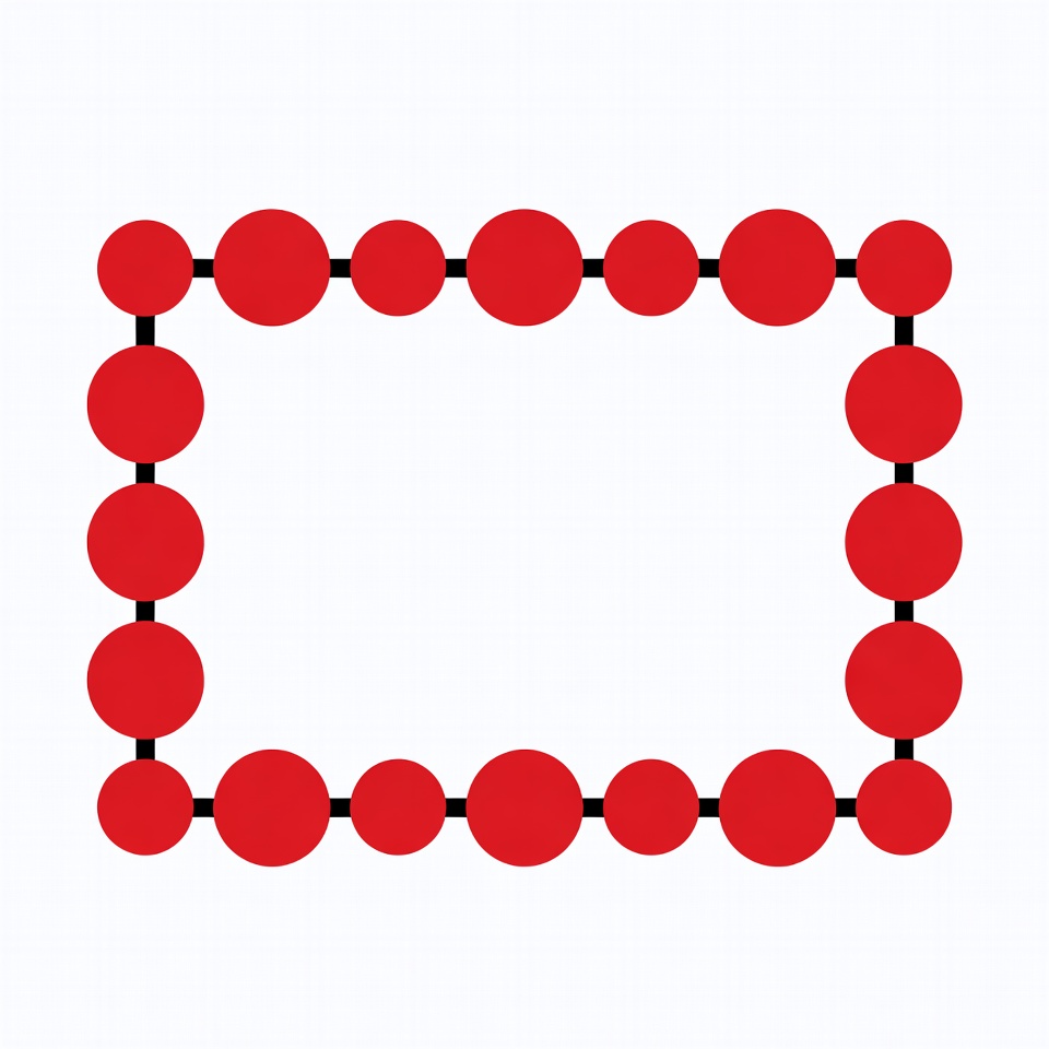 A rectangular frame made of evenly spaced red circles outlines an empty white space. The circles are connected by thin black lines forming straight edges and corners. The design is simple and isolated on a white background.