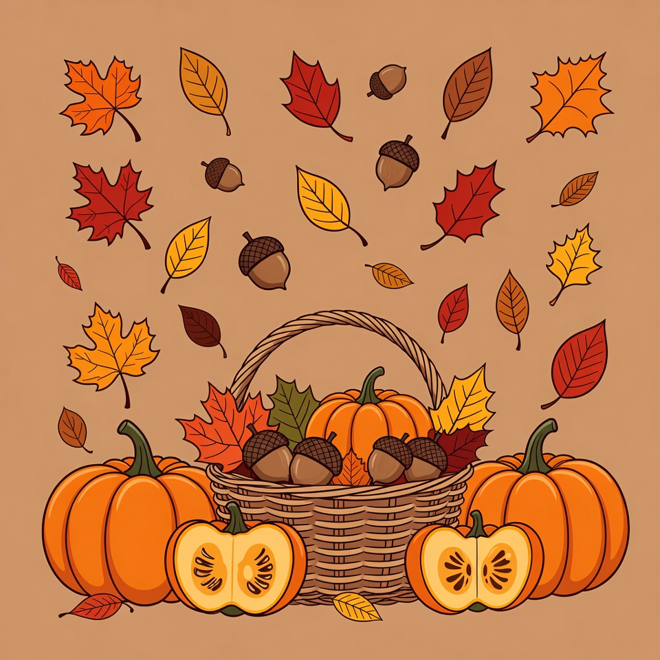 A woven basket holds orange pumpkins, some sliced open to reveal seeds, acorns, and colorful autumn leaves. Vibrant red, orange, and yellow leaves and acorns float around the basket against a warm beige background. The illustration features a festive fall harvest theme.