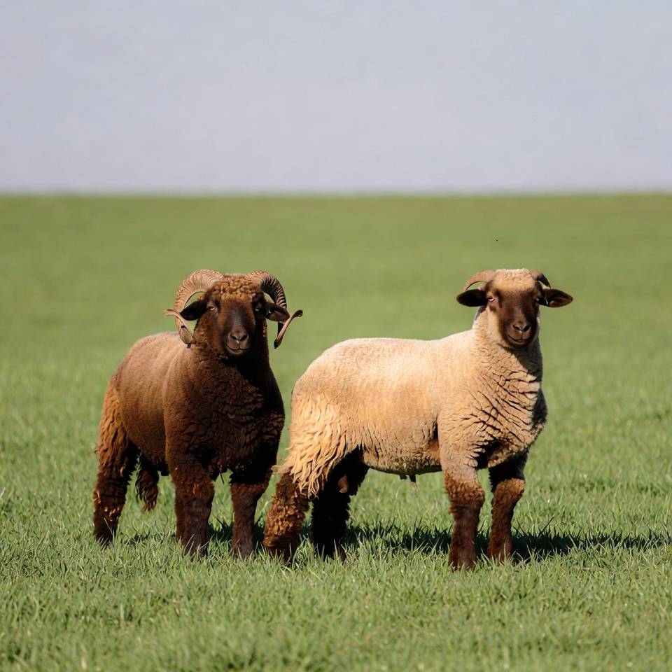 Two sheep, one brown and one white, stand side by side on a lush green grassy field. Both have curved horns and fluffy wool, with the brown sheep darker and the white one lighter in color. The background features a clear sky and open pasture.