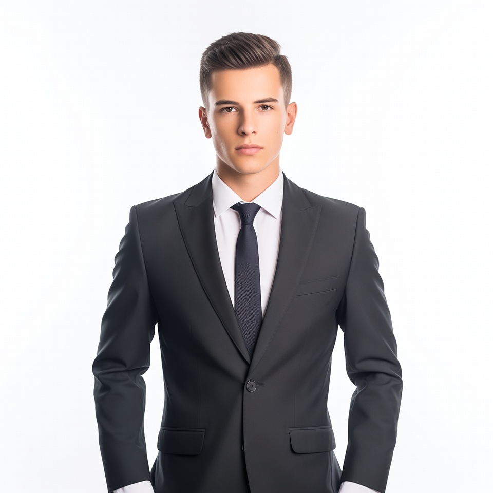 A young man with short dark hair stands confidently wearing a black suit, white dress shirt, and dark tie. He poses with hands at sides against a plain white background. His expression is neutral and professional.