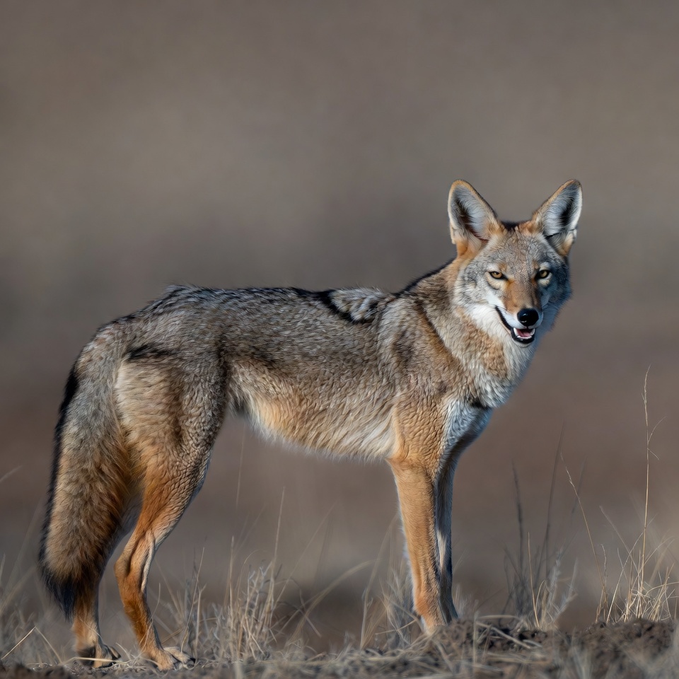 alert, animal portrait, bushy tail, canine, dry grass, field, fox-like, fur, golden grass, mammal, nature, outdoors, pointed ears, predator, reddish brown, side view, standing, wild animal, wildlife, yellow eyes, coyote
