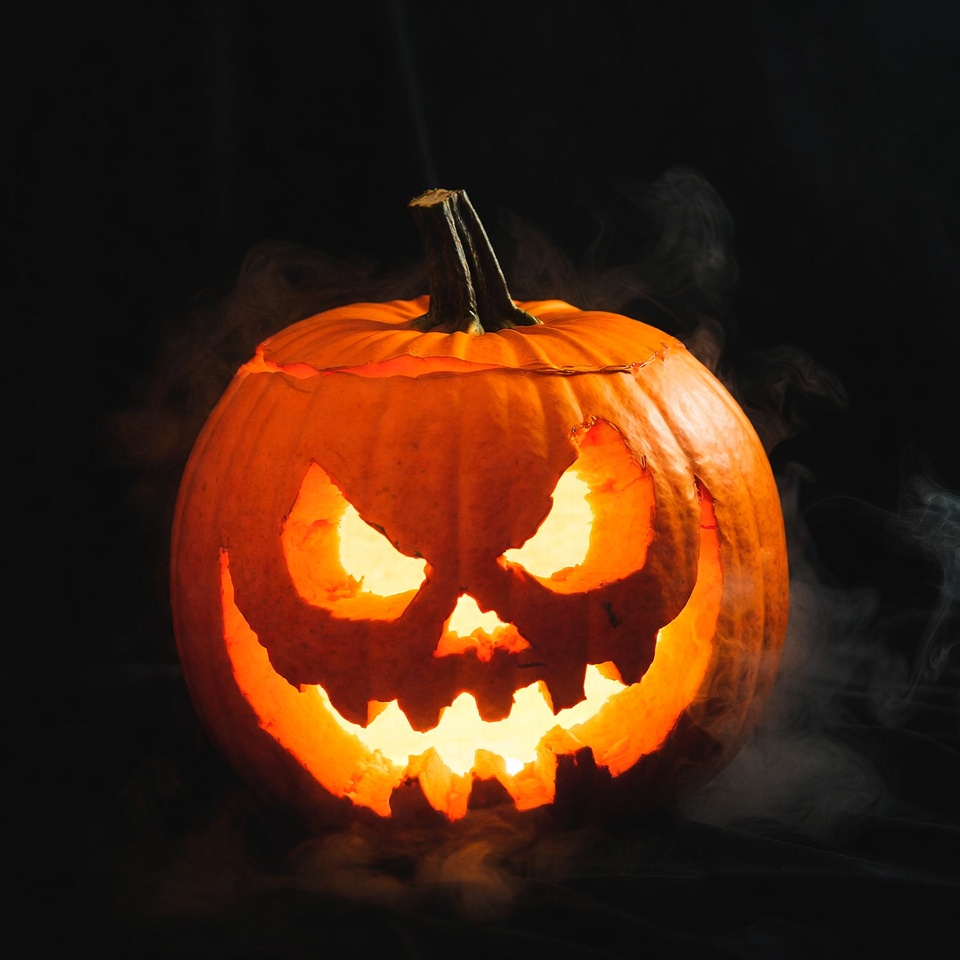 Halloween, black background, candle light, carved face, carved pumpkin, fog, glowing eyes, isolated, jagged teeth, lantern, lit pumpkin, orange pumpkin, pumpkin, scary face, sinister grin, smoke, spooky, stem, jack-o-lantern