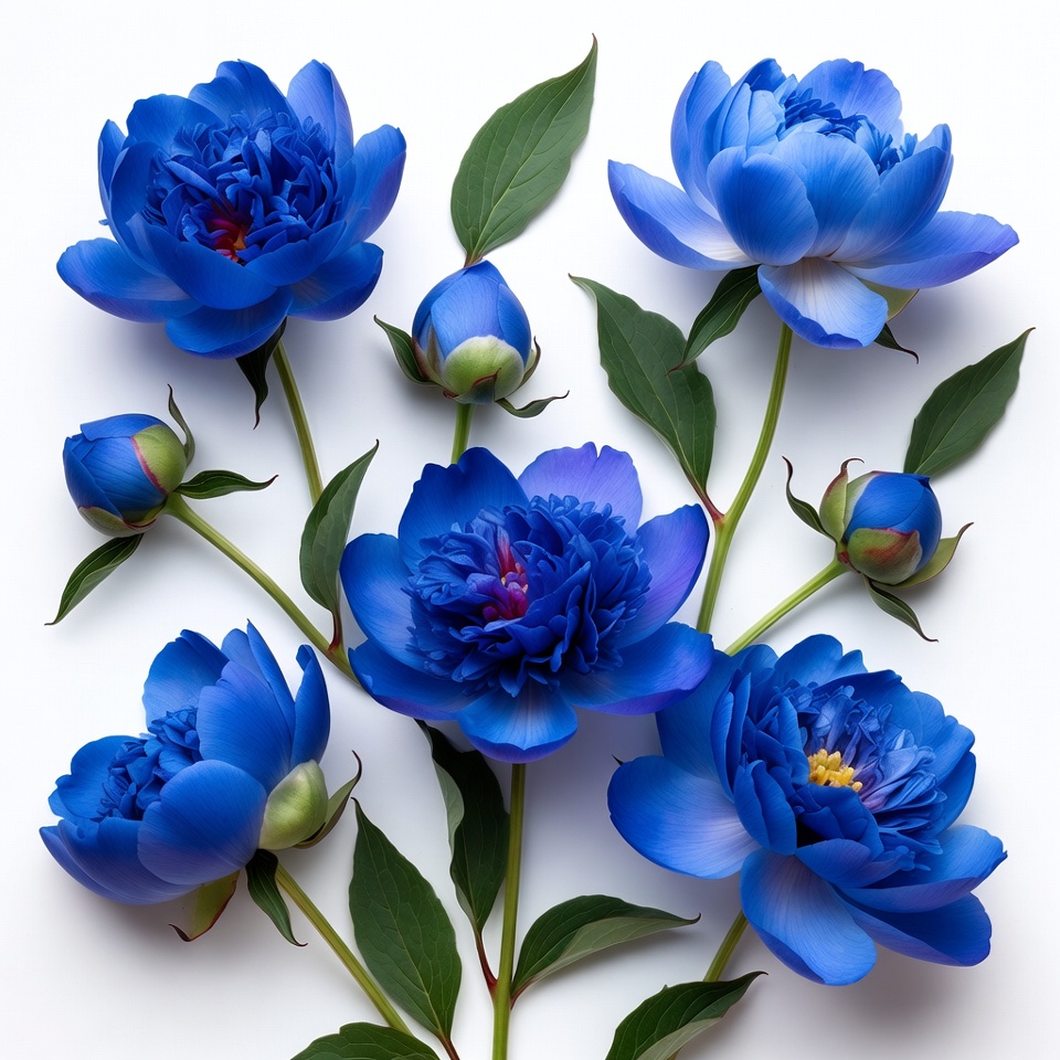 blooming flowers, blue flowers, floral cluster, flower arrangement, flower closeup, fresh peonies, garden flowers, green leaves, peony bouquet, peony buds, peony flowers, ruffled petals, vibrant blue, white background, blue peonies