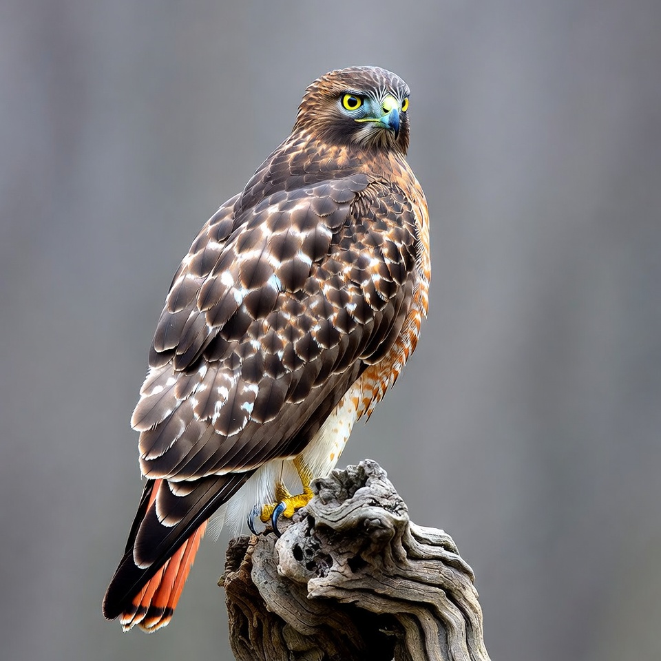 animal, bird, bird of prey, branch, brown feathers, feathers, green eyes, hawk, isolated background, nature, perched, raptor, speckled plumage, tail feathers, white feathers, wildlife, wood perch, yellow beak, red-tailed hawk