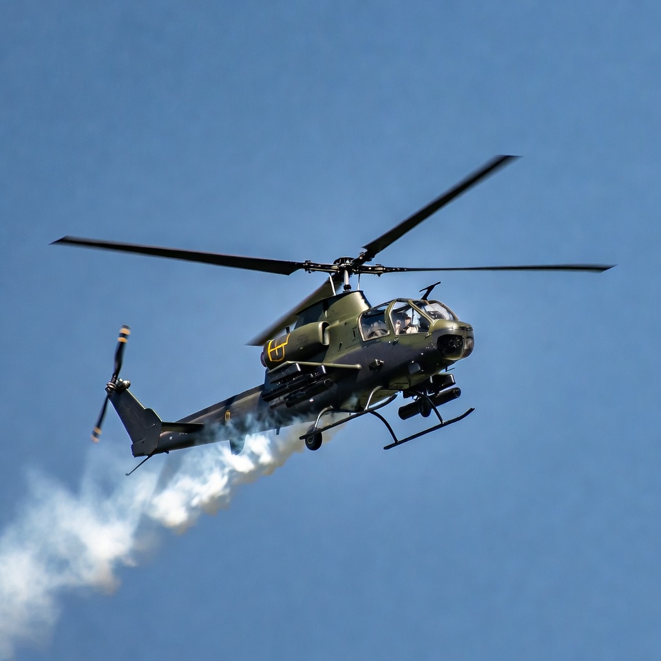 aircraft, army helicopter, attack helicopter, aviation, blue sky, flying helicopter, green helicopter, machine guns, military aircraft, military helicopter, rocket pods, rotors, smoke trail, yellow markings, helicopter